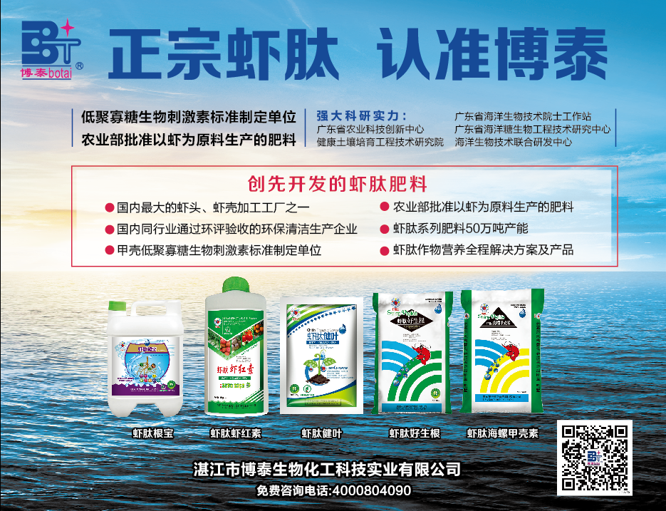 據(jù)了解,湛江市博泰生物化工科技實業(yè)有限公司專注于海洋生物資源的綜合利用開發(fā)產(chǎn)業(yè)20年,公司通過多項集成技術(shù)將從蝦頭、蝦殼、海螺等海洋生物中提取的多種活性氨基酸、甲殼素、殼聚糖、甲殼低聚寡糖、蝦腦磷脂、蝦紅素、活性鈣等功能活性成分,以及有益菌群等研制成新型功能性生物有機肥、土壤調(diào)理劑等系列海洋生物肥料,多種復(fù)合生物雌激素可以刺激作物產(chǎn)生大量次生代謝物,應(yīng)用到作物生長過程中,可顯著改善作物品質(zhì),提高作物產(chǎn)量,改良土壤,增強作物抗病、抗旱等抗逆能力;其中以海洋牡蠣殼、甲殼素、氨基酸為原料的新型土壤調(diào)理劑在我國土壤改良、農(nóng)藥化肥減施及重金屬修復(fù)上實現(xiàn)了重大突破;農(nóng)作物種植迎來新的希望。