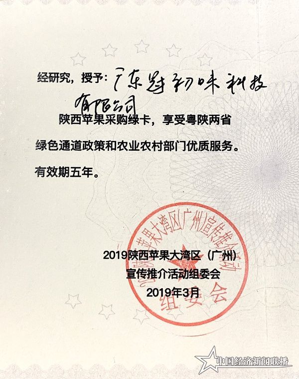 廣東冠初味喜獲陜西蘋果采購“綠卡”