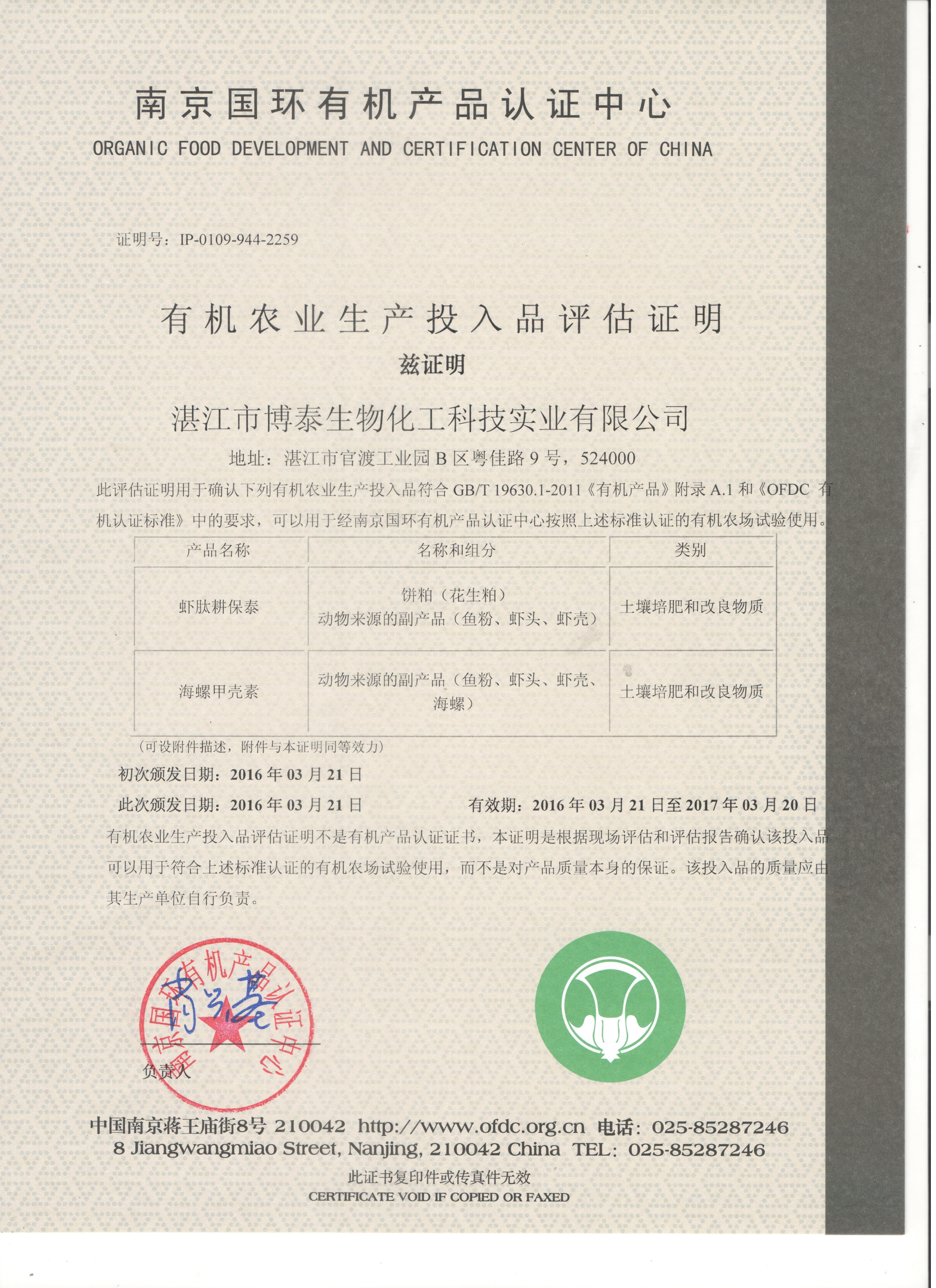 圖為“蝦肽耕保”和“海螺甲殼素”——有機(jī)產(chǎn)品生產(chǎn)資質(zhì)認(rèn)證證書