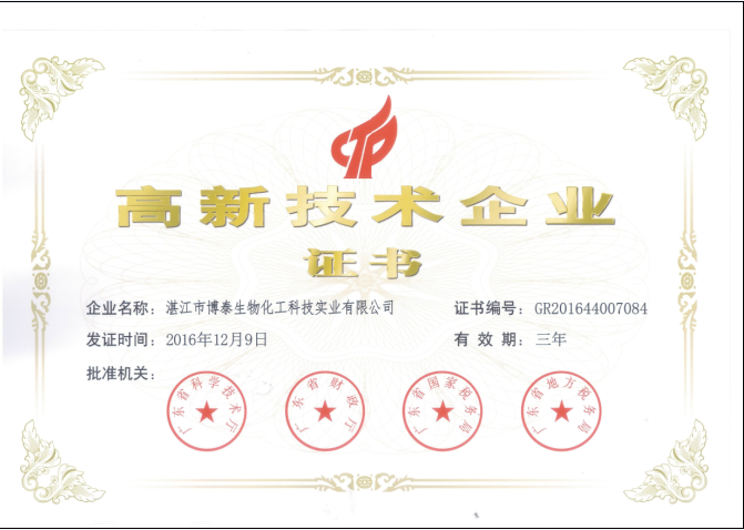 熱烈祝賀湛江市博泰生物化工科技實(shí)業(yè)有限公司通過(guò)2016年度國(guó)家高新技術(shù)企業(yè)認(rèn)證。