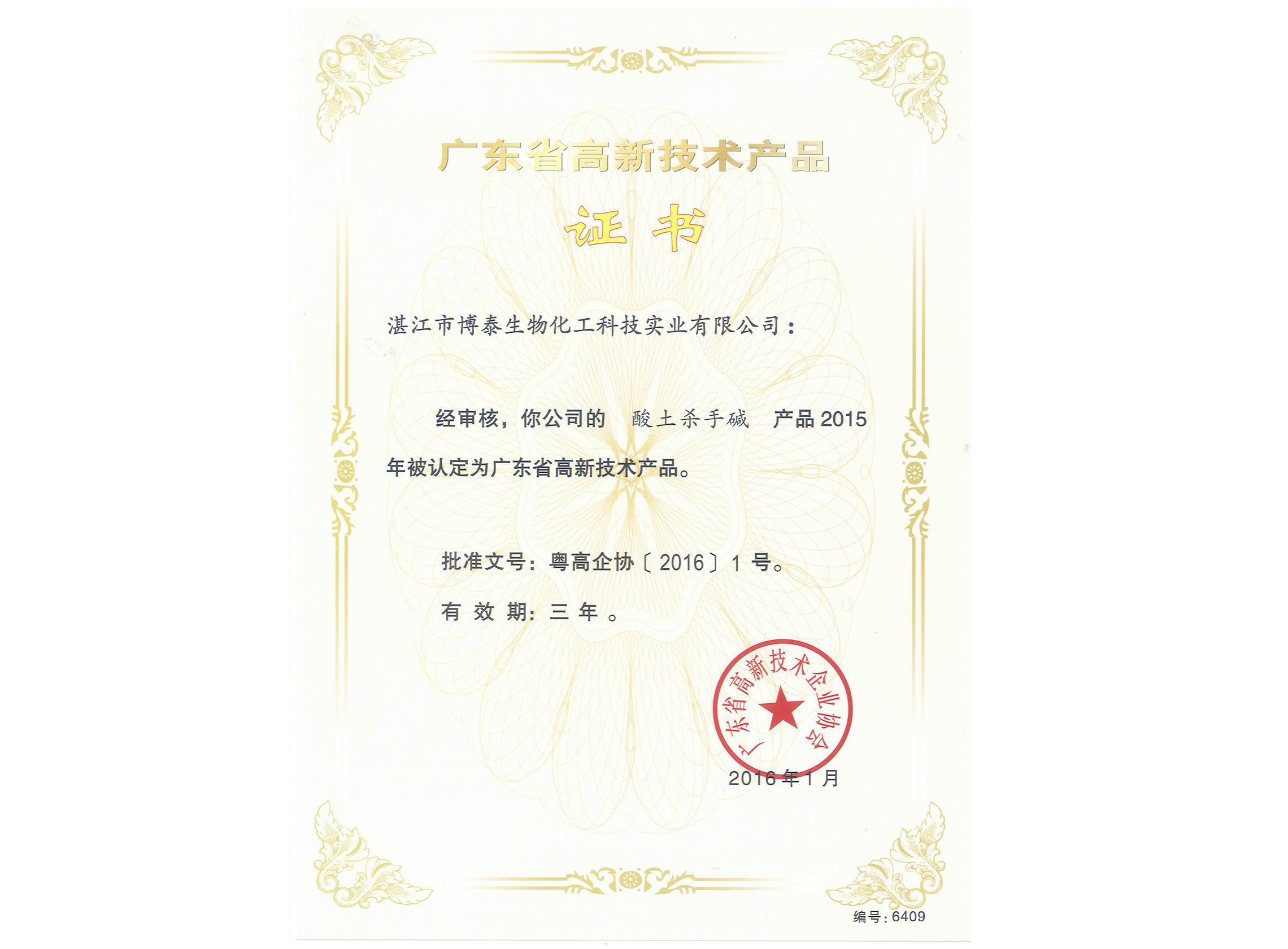 2016年伊始,我司便取得了開(kāi)門紅,先后獲得由廣東省高新技術(shù)企業(yè)協(xié)會(huì)頒發(fā)的兩個(gè)“廣東省高新技術(shù)產(chǎn)品”證書——“酸土殺手堿”和“蝦肽蝦紅素”。